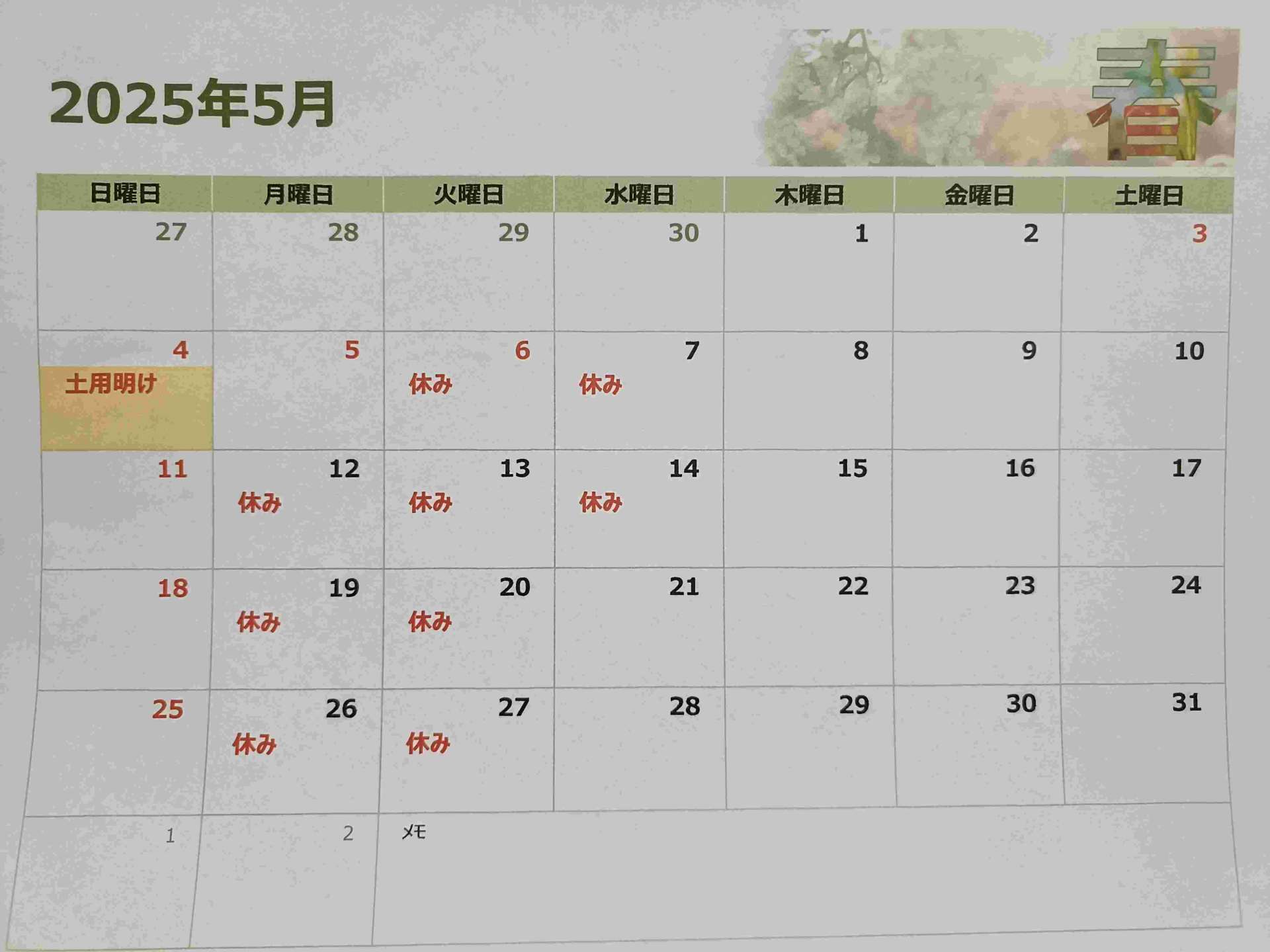 お知らせ 2025/05/01 岸根公園飲食店 横浜うなぎ旬や 5月営業カレンダーに成ります。 5日こどもの日は営業致しますのでご来店お待ちしております。 5月も「うなぎ旬や」をよろしくお願いいたします。
